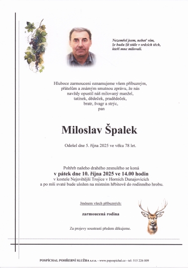 Poslední rozloučení s p. Miloslavem Špalkem se uskuteční v pátek, dne 10.10.2025 ve 14:00 hodin ve farním kostele v Horních Dunajovicích.